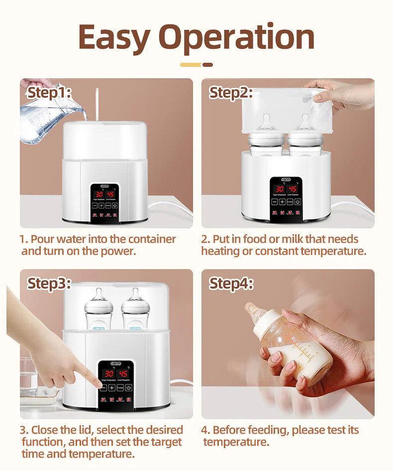 From pouring water to selecting your desired function and temperature on the smart touch screen, preparing your baby's milk or food is now simpler than ever. Follow these quick steps for perfectly warmed bottles, ensuring safe and comfortable feeding every time.